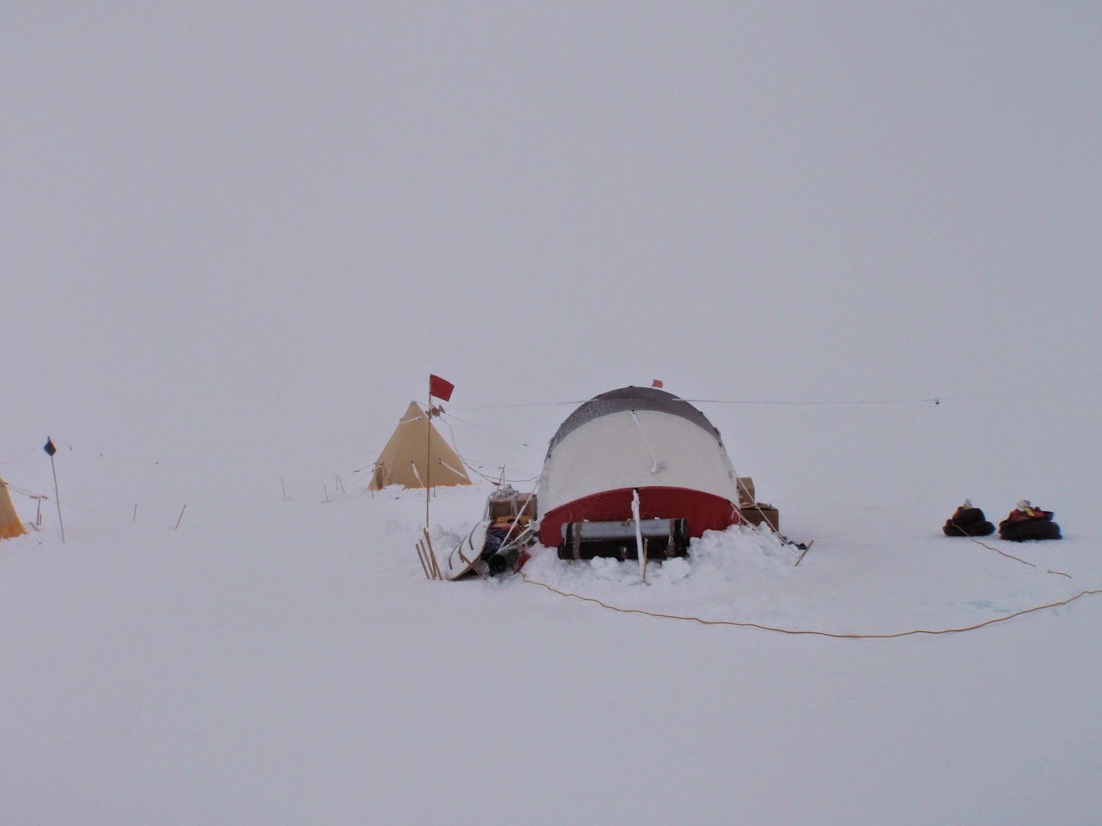 [Camp in 'nil and nil' conditions- it's impossible to see the horizon or identify surface features, this is what we often call 'flat' light. Very different from a windy storm, but the effects on aviation are the same!]